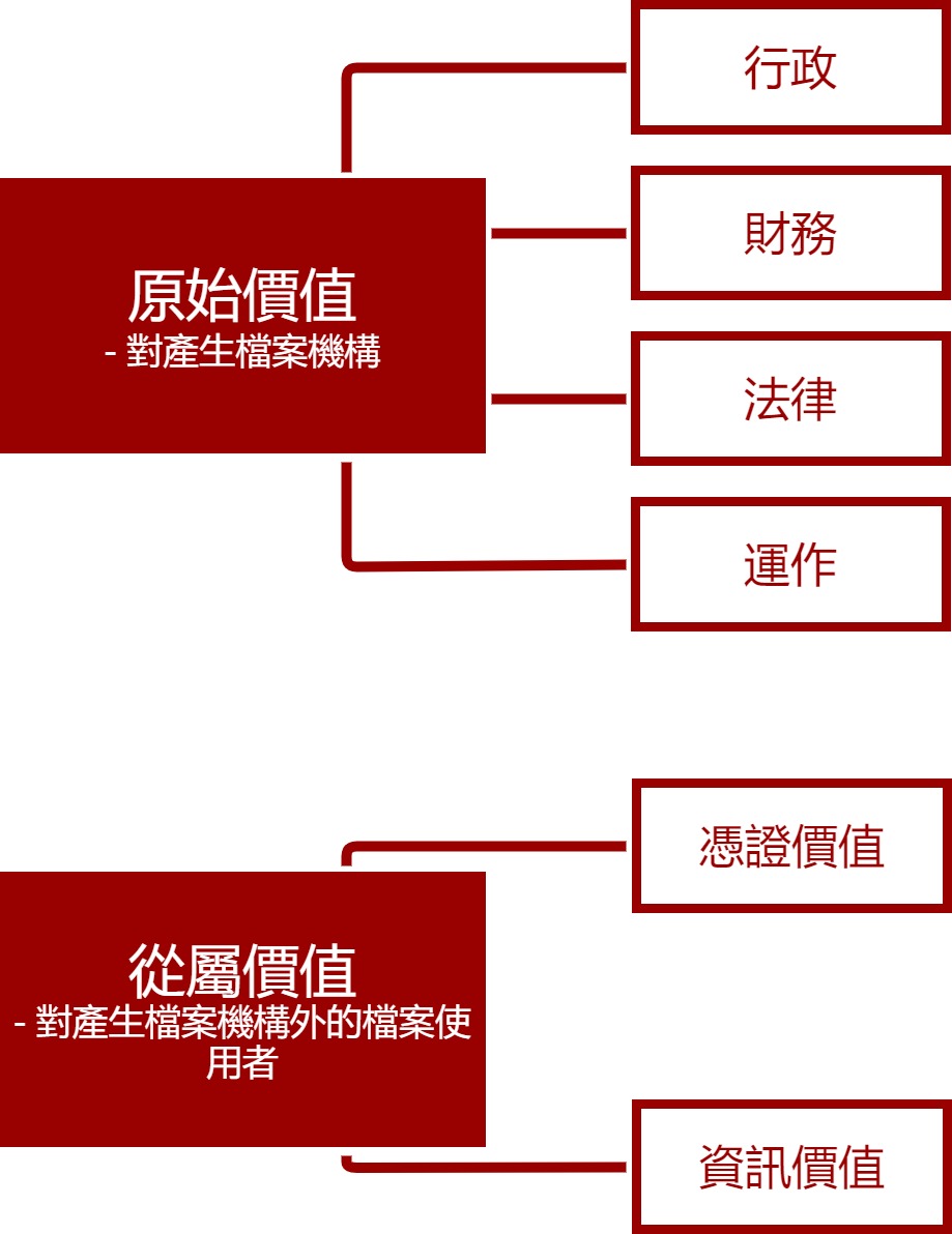 檔案鑑定透過研究、分析及評估以決定檔案的價值。整體而言,檔案的價值分為原始價值和從屬價值兩個層面。原始價值是檔案對其產生機構的價值。對政府而言,開立檔案是為了行政、財務、法律和運作等目的。從屬價值是檔案對產生機構外的其他使用者的價值。從屬價值可分為憑證價值和資訊價值:「憑證」價值源於檔案記載了機構的歷史、架構和職能;「資訊」價值則在於檔案提供了與人物、地點和主題相關的研究材料。
