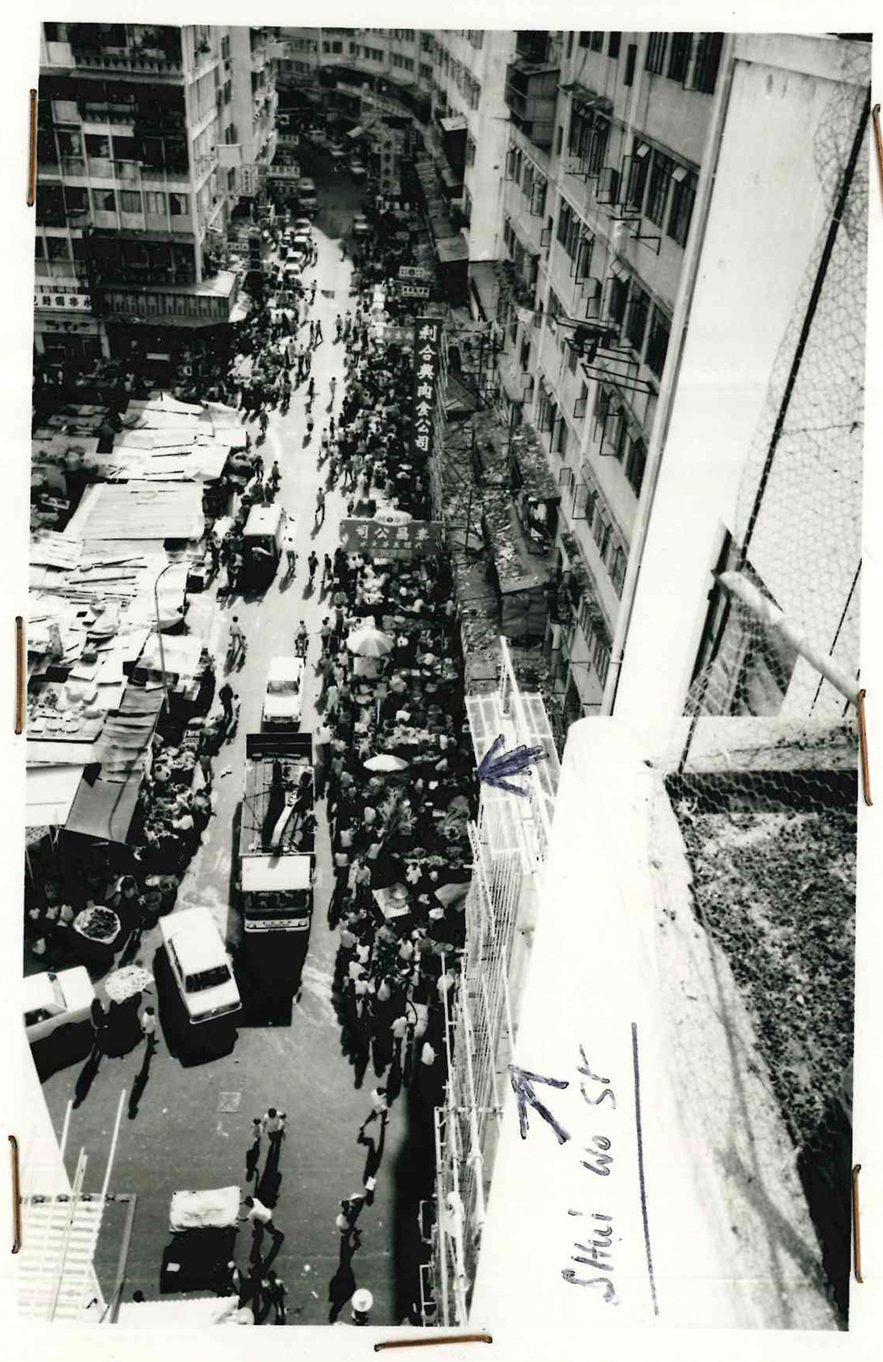 - 從高空俯瞰小販掃蕩行動前的瑞和街小販市場。照片上的箭咀標示了小販在行人路上擺賣的位置,1971年。(HKRS978-2-3)