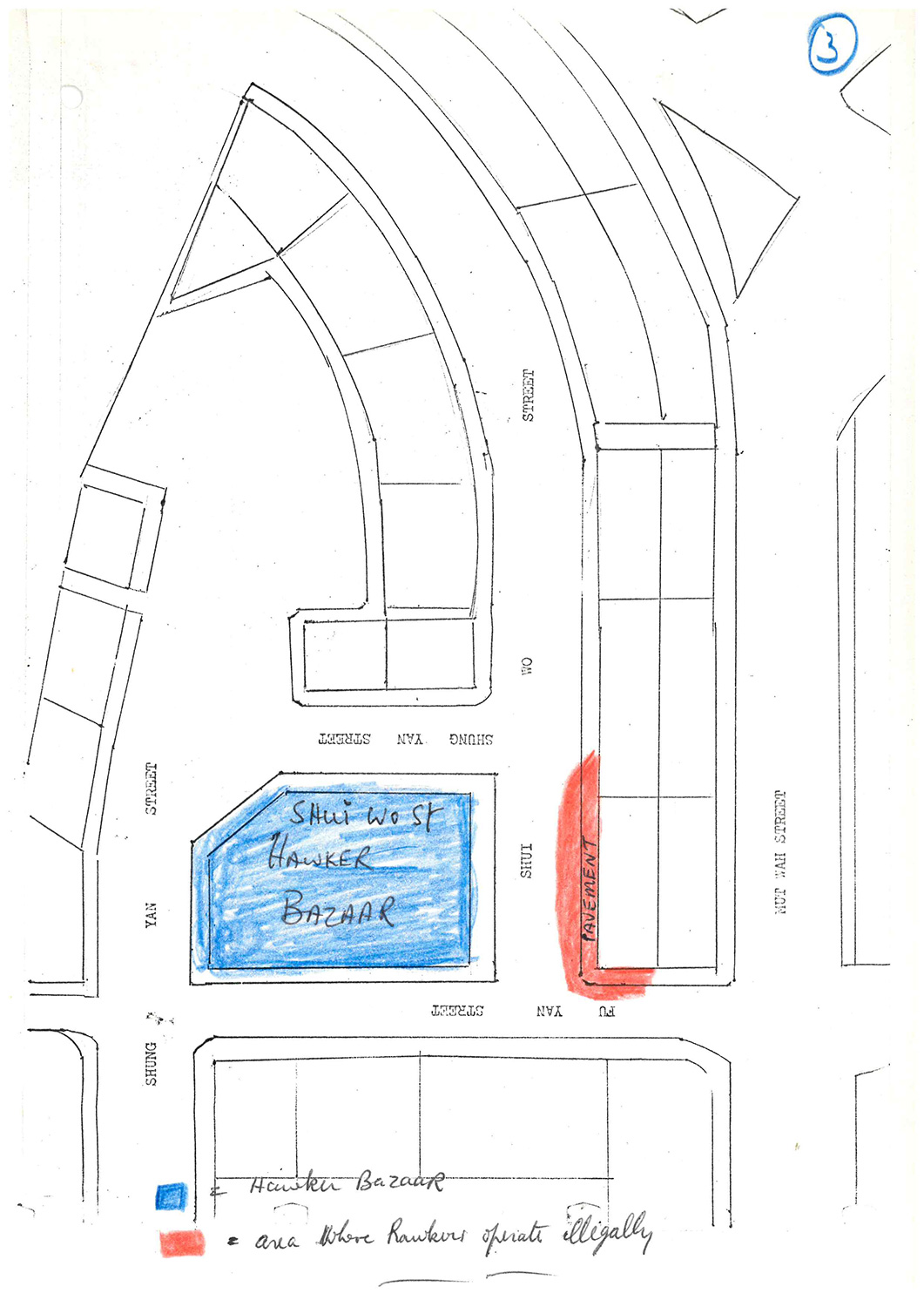 - 展示瑞和街小販市場和小販在瑞和街非法擺賣位置的平面圖,1971年。(HKRS978-2-3)