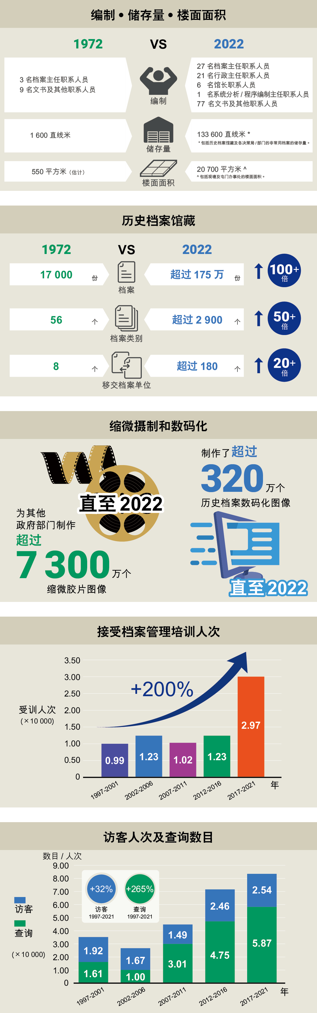 1972年共有17 000份档案和 56个档案类别,来自8个移交档案单位。 2022年共有超过175万份档案和超过2 900个档案类别,来自超过180个移交档案单位。 档案数目、档案类别及移交档案单位分别增长了超过100倍、超过50倍及超过20倍。