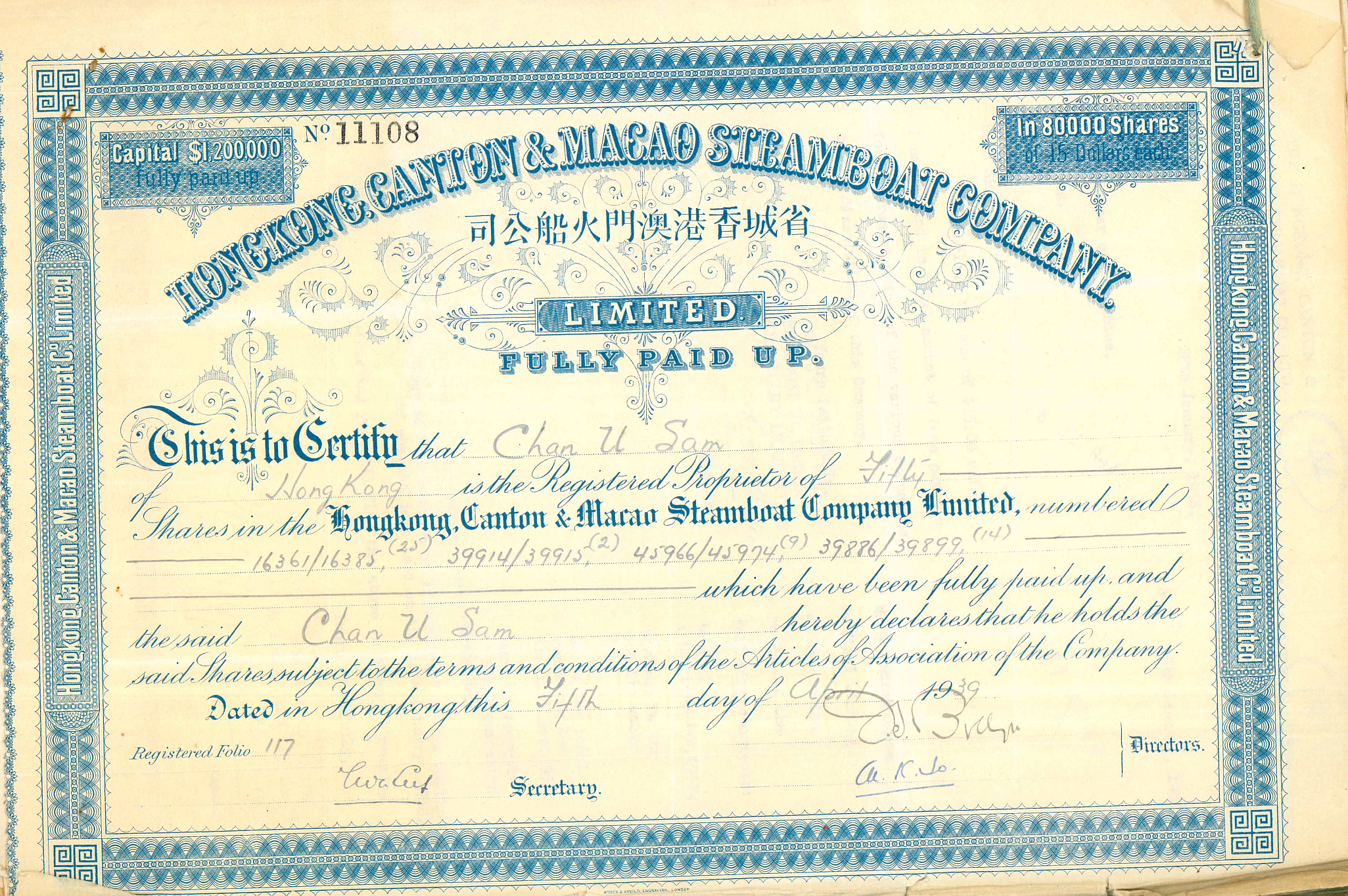 Stock certificate of the Hongkong, Canton and Macao Steamboat Company Limited, 1939.
