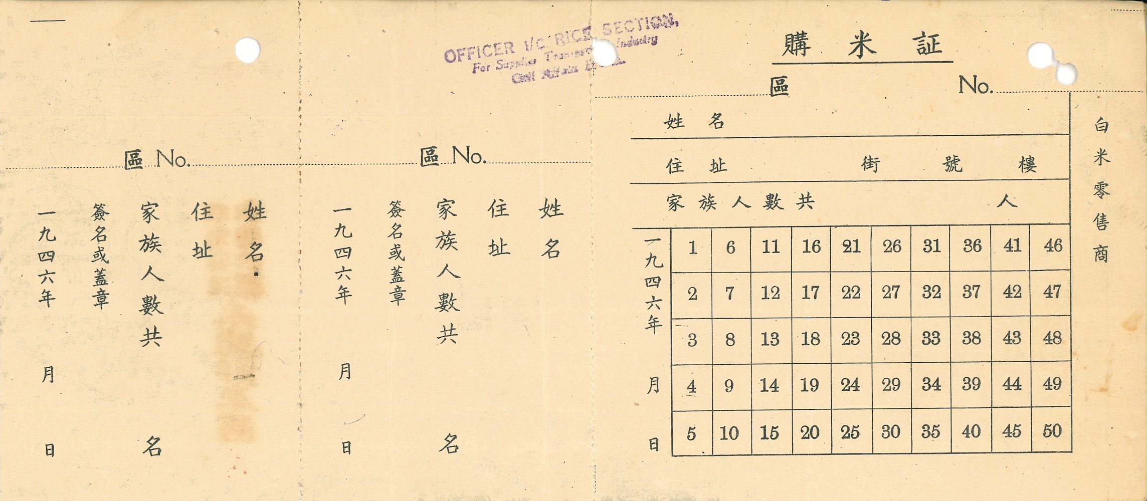 Rice Ration Card, 1946.