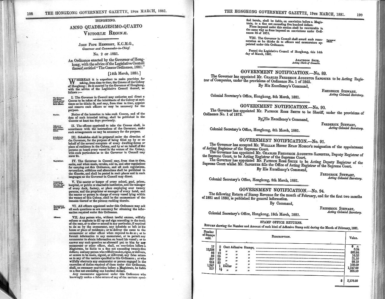 政府訂立《1881年人口普查條例》以立法規定進行人口普查,標誌著香港人口普查制度化,1881年。