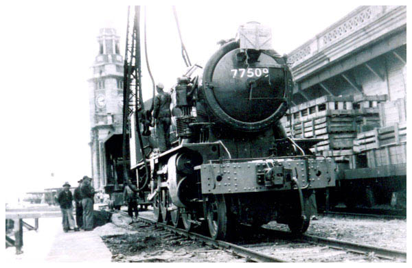 两帧有关在九龙车站卸下火车机件的照片,1947年(摘自九广铁路一份1945 - 1951年的档案)。