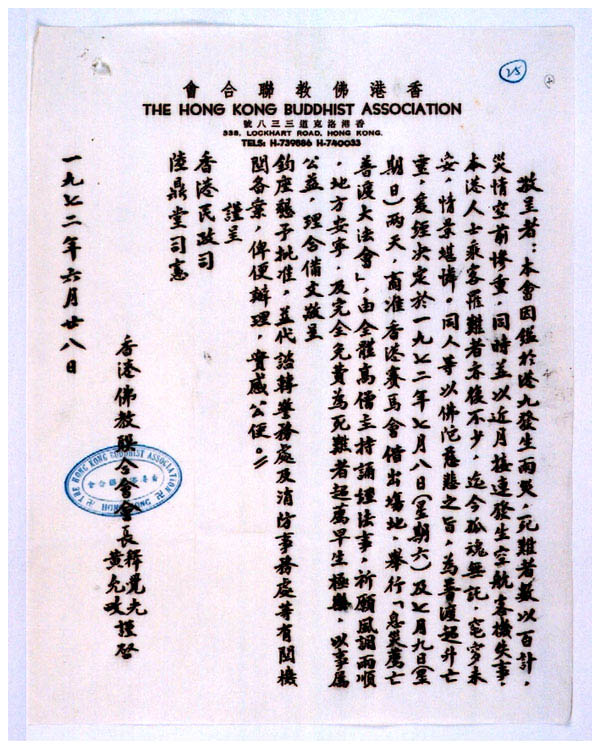摘自政務總署一份有關1972年「618雨災」的檔案 - 發自香港佛教聯合會的信函,1972年。