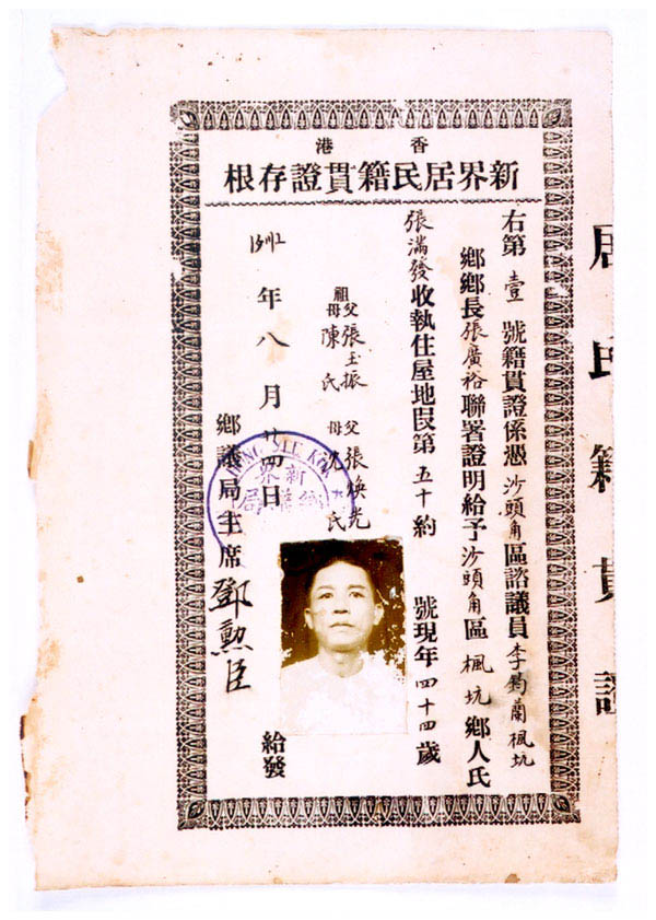 新界居民籍貫證存根,1936年。